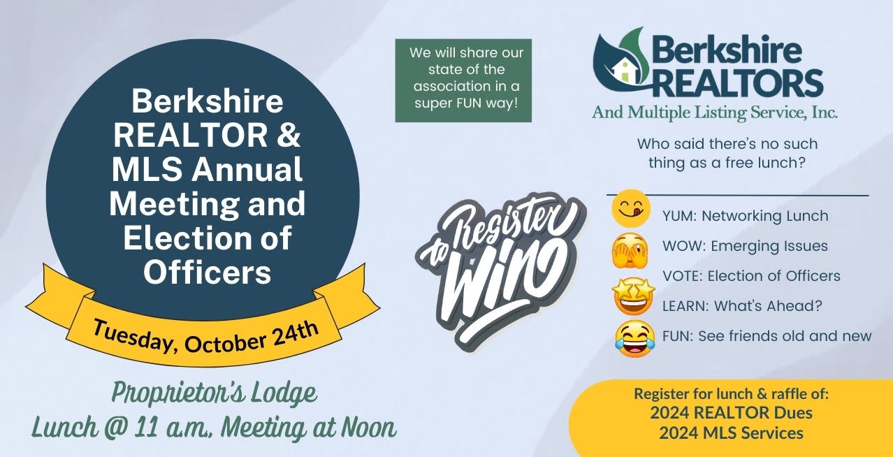 Join us at Proprietor's Lodge for the Annual Meeting. Buffet luncheon will be served at 11:00 a.m. with the meeting beginning at noon. Hear updates on the state of the association and what our local, state and national leadership see as the short-term and long-term goals and future of real estate. A lot is changing, let's connect and discuss. You will also vote to elect your 2024 leadership, review the 2024 budgets and network with your peers. Advanced registration is required, but the Board / MLS have made this event at no cost to Berkshire REALTOR members and/or Berkshire MLS Participant brokers.