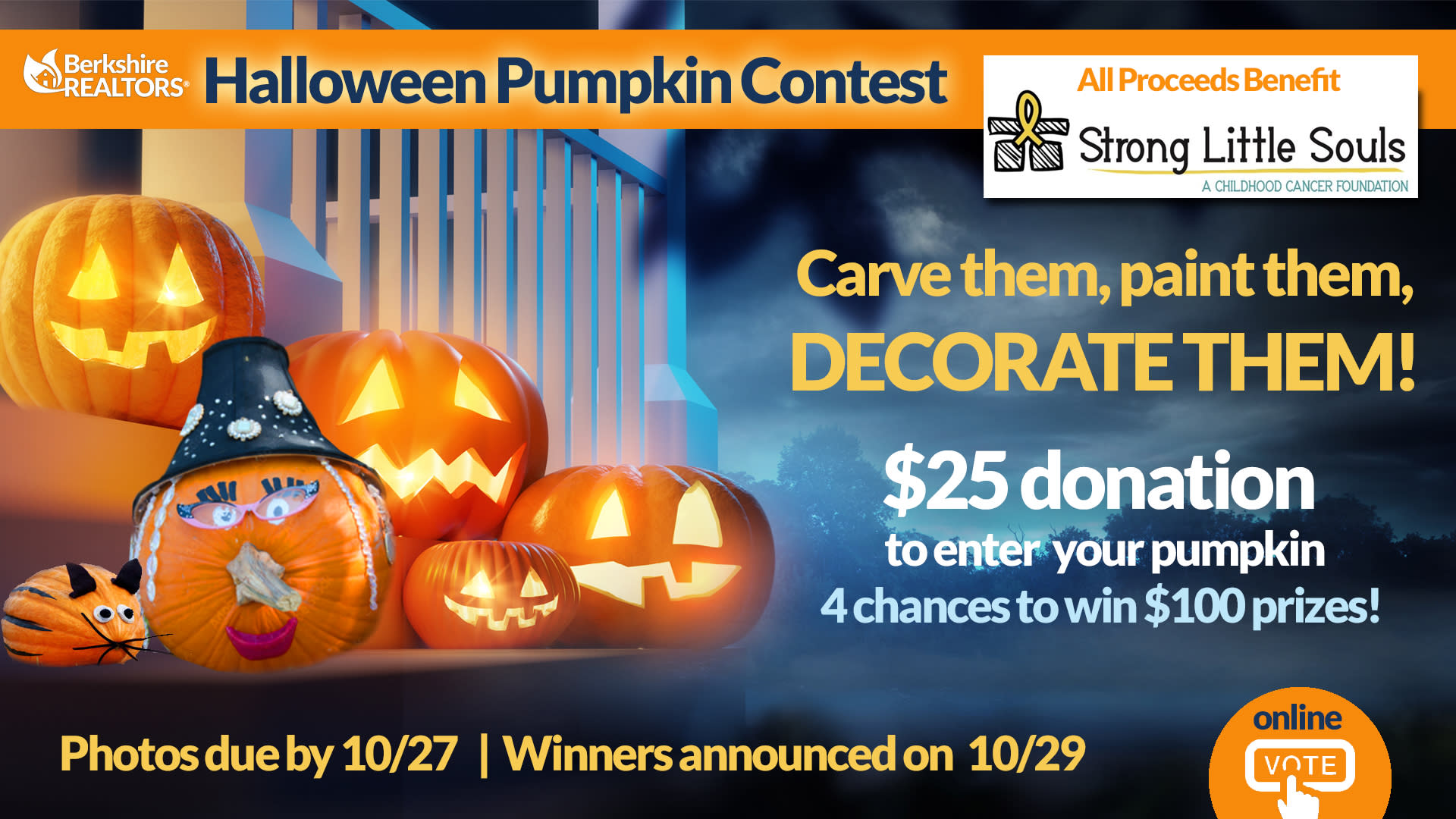 All it takes is a $25 donation to enter the contest - Emailing an original photograph of the pumpkin you decorated is due to Sandy@BerkshireRealtors.com by October 27th. Winners will be announced on October 29th. $100 prize for each of of 4 categories: (1) Most Unique/Original, (2) Funniest, (3) Scariest, (4) Best <12 Kids.